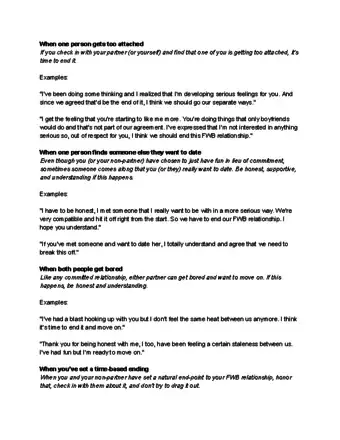 4Know when to say goodbye. There are three main reasons that a friends with benefits relationship ends: one person gets too attached, one person finds someone else he really wants to date, or both people just get bored and want to move on. The fourth reason is that there is a natural time-based end to the relationship, such as the end of a summer, the end of a long trip, or that one or both people is graduating.[8]