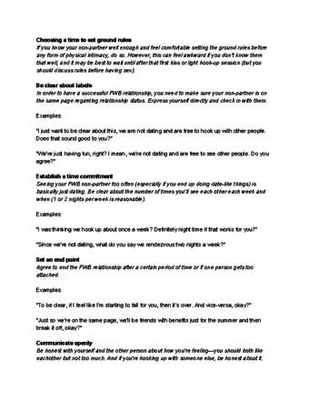 wikiHow Staff EditorStaff AnswerDifferent FWB find that different things work for them, so sit down with your friend and make a list of things you can both agree to. For example, you might make it a rule not to cuddle or not to hook up more than a certain number of nights in a row. Whatever you decide on, the most important rules are to communicate clearly and honestly and respect each other’s boundaries. -