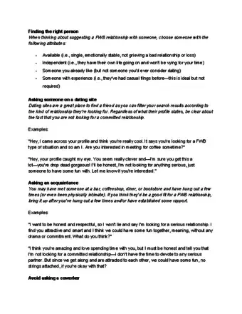 2Pick someone who won't get too attached. Friends with benefits relationships often end because one person starts falling for the other. So, unless you want to date the person, or you don't care if the person gets really hurt, you should avoid someone who will get attached. How do you know who will get too attached and who won't? Well, you can't figure this out with 100% certainty, but there are a few clues that the person may get too attached:[1]