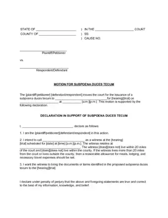 To subpoena documents, obtain a subpoena duces tecum request form from your state clerk of court in person or download it from the court's website. Fill in the general information on the form, then describe the documents you wish to subpoena and why they're necessary for your case. Then, submit the form to the clerk and wait for the clerk to approve your subpoena and issue the official subpoena forms. For more information about serving subpoenas, read on!