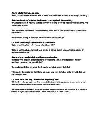 3Talk to your students directly about their performance. Schedule some time every few weeks to meet with each of your students in a one-on-one setting. Ask them how they feel like they’re doing in class, and invite them to share any concerns or frustrations they may have about the material they’re studying.[5]