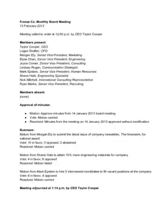 - The result of the vote. If the vote succeeds, write "motion carried." If it fails, write "motion failed."