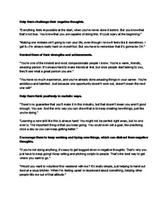 - Explain that loved ones can help them stay objective when they can’t stop thinking things like, “I’m a loser,” or “I’ll never be good enough.”