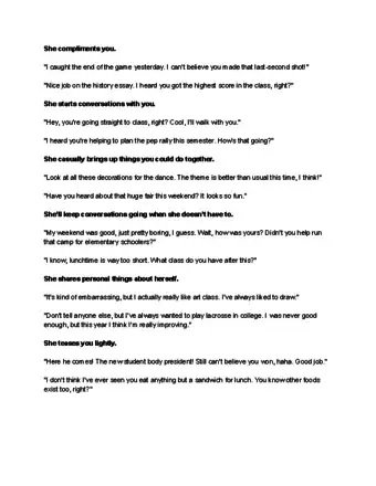 - As with nearly all of these signs, starting conversations could indicate that a girl has either a platonic or romantic interest in you. There’s no real way to know for sure without taking a direct approach, like asking her out.