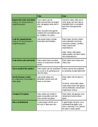 To tell if a ruby is real, start by looking at the shine of the ruby under a light. It should be bright and deep, like the shine of a stop light. If you’re able to, try to scratch the surface of the ruby with your fingernail or a coin to make sure it doesn’t break. Additionally, you can rub it against another surface, like glass or porcelain tile to see if it leaves a red mark, which means that the stone is artificially colored. Compare the ruby to other similar gems, like garnet or tourmaline if possible. For tips on consulting a professional jeweler to check your ruby, scroll down!