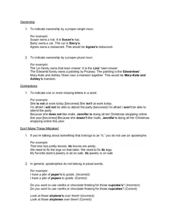 The apostrophe is used for two reasons: to show that certain letters in a contraction are missing, and to indicate ownership. The rules for apostrophes vary with the type of word. Apostrophes help make your writing clear and short.