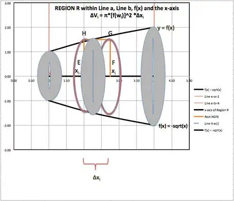 - Revolve the region R about the x-axis to generate a solid of revolution, using the n rectangles to sweep out n right circular cylinders. The cylinders swept out by the typical rectangle, eg. Rect HGFE, is shown in the following Diagram; since the radius of its base is f(wi) and its altitude is ∆xi, its volume is ∆Vi = π*[f(wi)]^2 *∆xi.