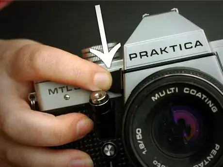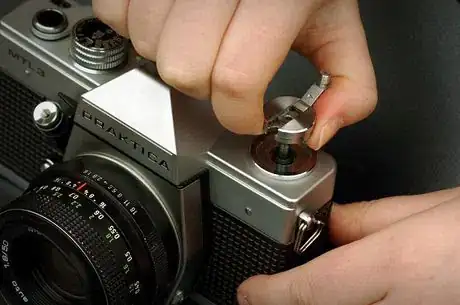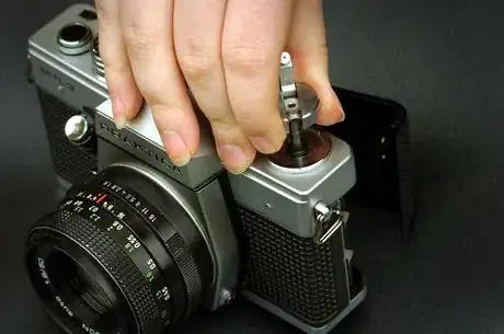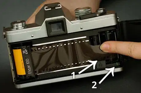 1Lift the rewind knob. This is on the top of the camera, towards the left if the back of the camera is facing towards you.