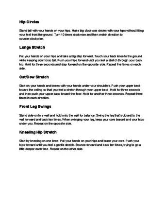- For one stretch, bend your right knee at a 90 degree angle, keeping your right foot flat on the floor. Bend your left leg back behind you, parallel to your other leg and with your left foot stretching behind you. Hold for 30 seconds and then switch the positions of your legs.[7]