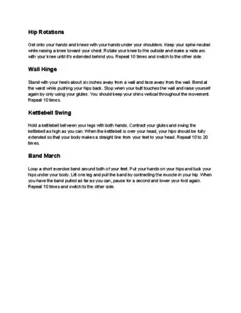 - Lie on your back with your knees bent at 90 degree angles. Bend your right leg in front of you while lifting your hips until you form a perpendicular angle with your right leg. Move your right leg towards the ceiling. Then, lower your leg slightly. Do 10 repetitions and then switch legs.