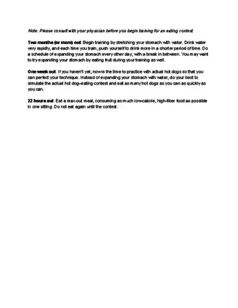 2Eat the exact food from the contest two weeks out. Use the competition website or call to find out the exact brands and preparation of the foods you’ll be eating. Mimic this meal as closely as you can to get used to the food. Don’t eat the amount of food you’ll be eating at the contest, however.[11]