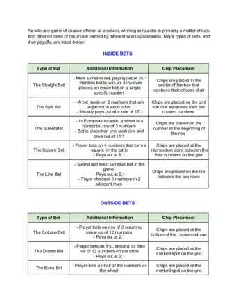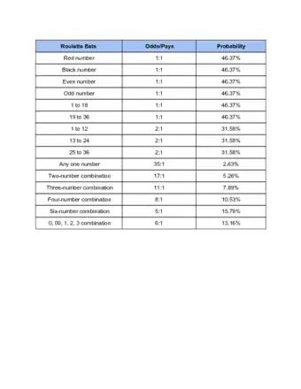 - Outside bets, such as even/odd and red/black, are lower risk, but the payout is only 2:1 or 1:1. There are blocks labeled with various bets on the table outside of the chart of numbers. This is why they're called outside bets, while wagers placed on the numbers are called inside bets.