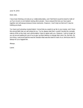 2Focus on the good times. Spend at least part of the letter talking about what you like about the person and your relationship together. In most relationships, there are good times as well as bad, and no matter why you're saying goodbye, you can still end on a good note by taking time to think about what was good.[8]