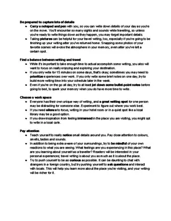 1Take advantage of "dead time." For example, if you are waiting for a train, sitting on the plane traveling to your next destination, or waiting to meet people for lunch, use this time to work on your writing or jot down notes in a journal. You’ll find that you’ll have a lot of dead time while you’re traveling that you can take advantage of.[9]