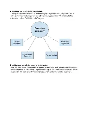 8Write the executive summary. Your executive summary will serve as an introduction to your business plan. It will include your company's mission statement and provide readers with an overview of your products or services, target market, and goals and objectives. Remember to place this section at the beginning of your document.[14]