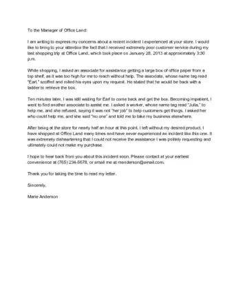 2Quickly get to the point of your letter. The very first line of your letter should clearly address why you are writing the letter and what your exact complaint is. Give as many pertinent facts as possible, including the date, time and location where you made the purchase or received the service, along with any relevant serial or model numbers.[3]