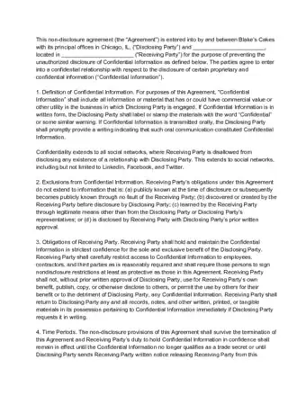 - This portion of the agreement is designed to set the boundaries of confidential information without disclosing the information itself. For example, your agreement may list “all client lists” as confidential, but does not have to disclose the content of those lists.[5]