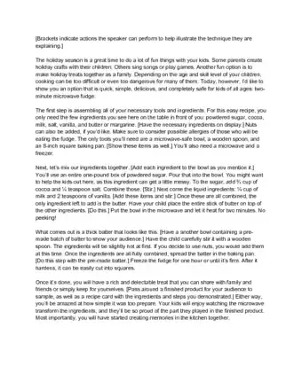 - Take note of anything you'll want to add to the speech to explain the visual aids. For example, do you want to say something like, “I'm using unbleached white flour, but you can also used bleached flour if you prefer.”