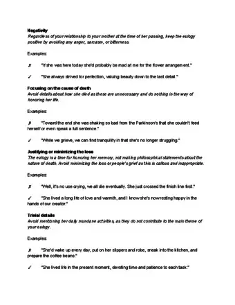 - Stay away from trivial facts that do not contribute to the main theme of your eulogy, such as her daily habits.