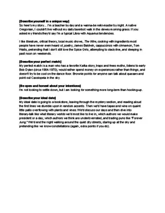 - ↑ http://www.cosmopolitan.com/sex-love/advice/a2958/how-to-write-an-online-dating-profile/