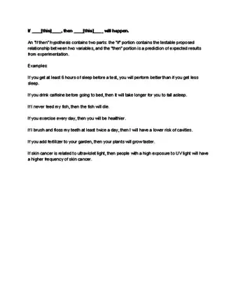 6Write a research hypothesis. Often, hypotheses are stated in the form of if-then sentences. For example, "if children are given caffeine, then their heart rates will increase." This statement is not a hypothesis. This kind of statement is a brief description of an experimental method followed by a prediction and is the most common way that hypotheses are misrepresented in science education.