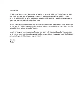 To write a letter requesting a favor, start by introducing yourself if the recipient doesn't know who you are. Then, politely and clearly state the favor you need by saying something like "I would be grateful if you would let me borrow your tools so I can fix my truck." Make sure you provide all of the details that they would need to fulfill your request, including any relevant deadlines. Also, say something like "I understand if you're not able to do this" so the recipient doesn't feel pressured. To learn how to format your letter, keep reading!