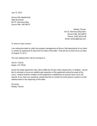 - You can write something as simple as, "I, John Smith, live at [address]. I am writing to notify you of my intent to terminate the lease agreement between myself and you. I am providing the required 30 days notice, which will start from the day this letter is dated."