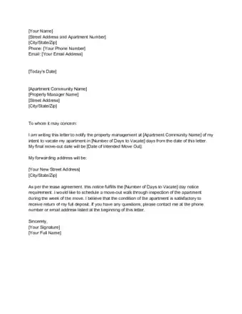- Your request may look something like this: "In addition to providing the required notice to vacate, I am also respectfully requesting that any and all refundable deposits be returned to me, in full, within the required period set forth under the law. Per our Agreement, I will clean the apartment, fix any damage, and will have the carpets professionally cleaned. In addition, I will vacate the premises on time and will return all keys to you as requested."