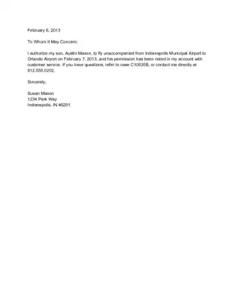 - Example for consent to travel letter: "I authorize (adult's name) to take (child's name) to the Grand View Hotel in Oakville, South Dakota from January 12th through January 18th, and supervise (him/her) on excursions in the surrounding area."
