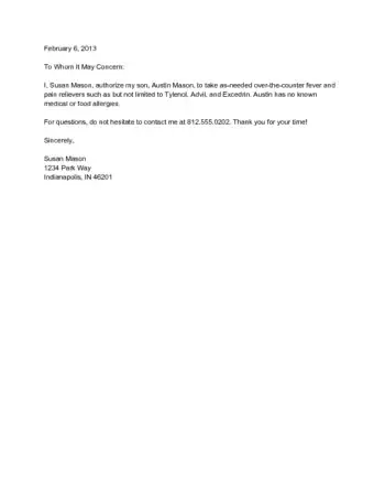 - Medical authorization: "I, (full name), grant (full name of babysitter/teacher/etc.) the authority to obtain medical treatment for my child, (full name of child), as detailed below."