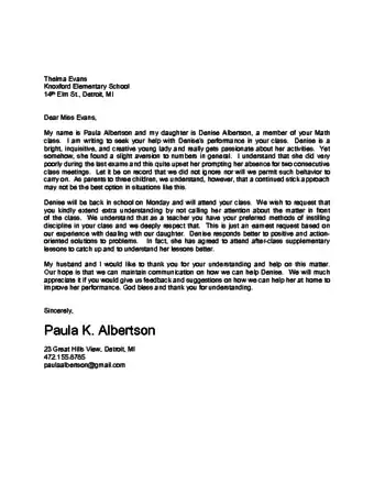 - Include a brief introduction with your and your child’s names and why you’re writing. For example, write “Dear Mrs. Maier, My name is Teresa Lutz and I am Sophia Lutz’s mother. I am writing because she is having difficulty in math class.”