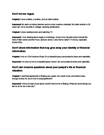 - If your pen pal has questions, answer them. If there are any questions you don’t want to answer, tell your pen pal directly.