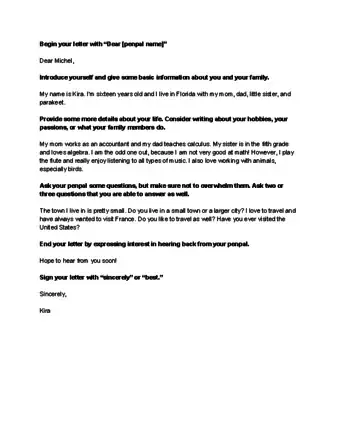 - Next, develop the body of the letter. This is where you'll communicate at length with your pen pal. It can be 2 to 5 paragraphs.