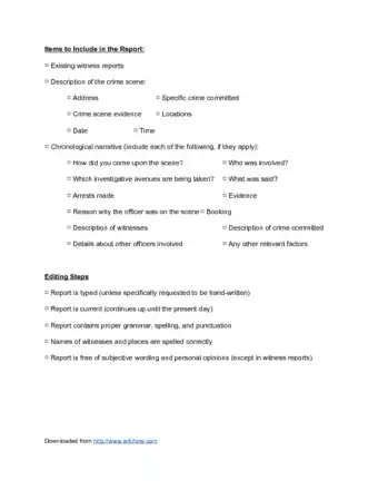 If you're a police officer or security guard, knowing how to write up a detailed and accurate report is important. A well written incident report gives a thorough account of what happened and sticks to the facts. If you're trying to write a police report, or are curious about how the police put together their reports, learning what to include and how to format the report is helpful.