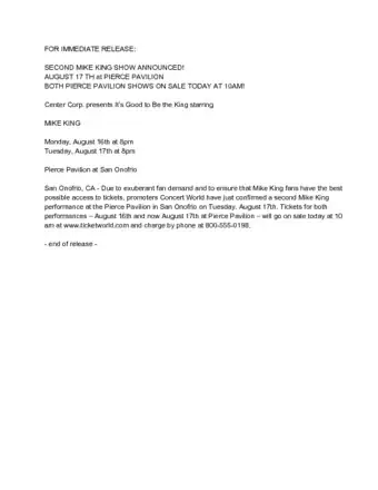 4If possible, include a link to an online copy of the same release. It's good practice to keep a log of all of your press releases housed on your own website. This can make providing such a link easier to produce, as well as keeping a record for historical purposes.