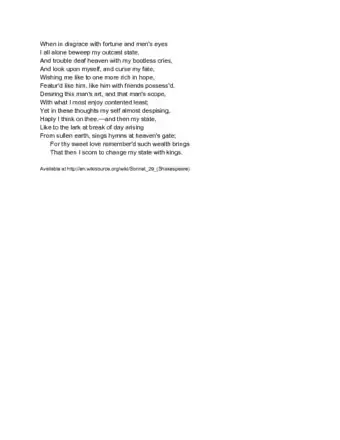 - To create more variation within the lines, it’s also possible to include 11 syllables, which would end the line on an unstressed syllable. For example, this line from Shakespeare’s Sonnet #29: “Yet in these thoughts my self almost despising,” the stresses are In, thoughts, self, -most, -pis-.