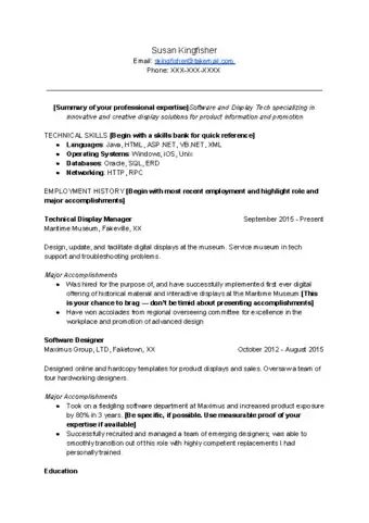 - After "Summary," skip 2 lines and add the heading “Technical Skills,” then skip 2 lines and add a heading for relevant experience, such as “Relevant Experience” or “Professional Experience.” After experience, type a heading titled “Education” or “Education and Training.”