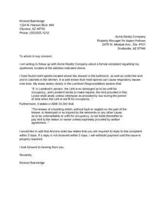 1Review the tenant laws in your state or country. Many places have very specific requirements on how a landlord must be notified about repairs or other conditions that are making your apartment or home unlivable. Before drafting a complaint letter, you should review the landlord-tenant laws for your area.