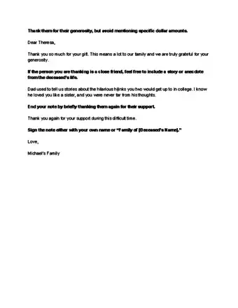 3Avoid mentioning specific dollar amounts. If you’re writing a thank you note to someone who gave a monetary donation in memory of your loved one, thank them for their donation, but don’t mention how much they gave. Simply say that you are thankful for their generosity in honoring your deceased loved one.[6]