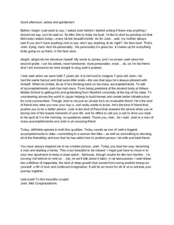 - Never use a premade template you find on the internet to write a wedding speech. Your speech should be a product of your own unique thoughts, feelings and experiences.Thanks!