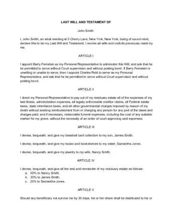 - For example, you may write: “To Tara Smith, I give my house at 123 Cherry Lane, and to Bob Jones, I give 50% of the remainder.”