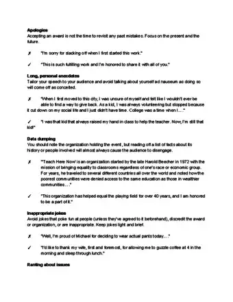 - Avoid negative or apologetic statements during your speech. They can make you seem ungrateful.Thanks!