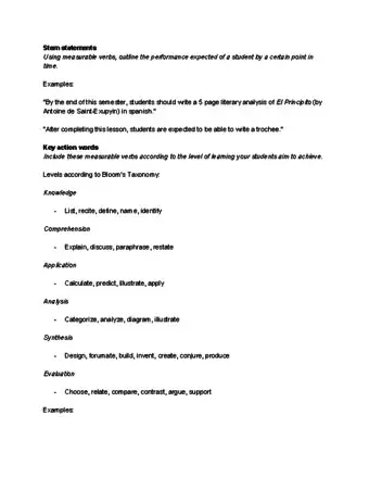 - Your stem statement outlines the duration of time your students need to have mastered a certain skill. If you're writing an educational objective for a particular lesson, specify that lesson in the objective rather than writing something like "By the end of this course..." Instead, opt for, "By the end of today's lecture..."