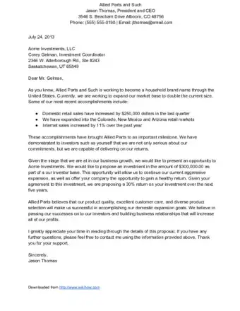 Before you write an investor proposal letter, read through the requirements of Regulation D under the Securities and Exchange Commission (SEC) so you’ll know the specific rules you have to follow in the letter. In general, your investor letter should include the securities’ initial sales price, the deal terms, the intended use of the funds, and financial statements for the issuer. You should also include information about your leadership team to help build investor confidence. For advice from our financial reviewer on how to request funding, keep reading!
