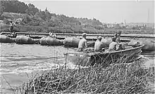 Treadway bridge built over the Neckar River near Heidelberg as a training assignment in preparation for planned deployment to the Pacific Theater for the invasion of Japan