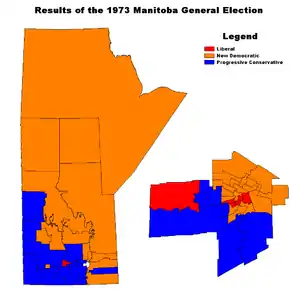 The 1973 Manitoba general election was held on June 28, 1973 to elect Members of the Legislative Assembly of the Province of Manitoba, Canada. It was won by the social-democratic New Democratic Party, which took 31 of 57 seats to win government in its own right for the first time. The Progressive Conservative Party finished second with 21, while the Manitoba Liberal Party took the remaining five. The Manitoba Social Credit Party lost its only seat.