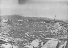 A total of 32 people lost their lives in the tornado, and about 1,150 were injured in Xenia, several of whom took proper shelter. In addition to the direct fatalities, two Ohio Air National Guardsmen deployed for disaster assistance were killed on April 17 when a fire swept through their temporary barracks in a furniture store. The memorial in downtown Xenia lists 34 deaths, in honor of the two Guardsmen.[25][26] About 1,400 buildings (roughly half of the town) were heavily damaged or destroyed. Damage was estimated at US$100 million ($471.7 million in 2013 dollars).[27]
