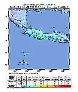 The 2017 Java earthquake occurred on 15 December 2017 when a moment magnitude 6.5 earthquake struck the Indonesian island of Java, specifically the city of Tasikmalaya on 23:47:58 West Indonesian Time (16:47:58 UTC) in West Java, Indonesia. The earthquake struck at a depth of 91 km and was categorized as a strong but deep earthquake.[2] It was initially registered as a 7.3 magnitude earthquake by Indonesian agencies. Widespread damage was reported across Tasikmalaya, the nearest major city to the epicentre. A tsunami warning was immediately issued by the authorities but was subsequently cancelled.[3] Four people have been confirmed dead.[4]