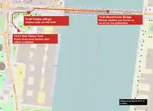 At 14:40 local time on 22 March 2017,[6] a grey Hyundai Tucson,[7][8][9][10] hired in Birmingham,[7] was driven at up to 76 miles per hour (122 km/h)[11] into pedestrians along the pavement on the south side of Westminster Bridge and Bridge Street, causing multiple casualties.[12][13] One of the victims, a Romanian tourist, was thrown by the car's impact over the parapet of the bridge into the River Thames below. Having been knocked unconscious and sustained severe injuries from the fall, she was rescued by the crew of a river cruise and brought aboard a London Fire Brigade boat.[8] She later died in hospital from her injuries.[14]