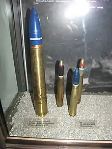 Three Finnish and Italian 20×138B cartridges next to a 37mm anti-tank shell